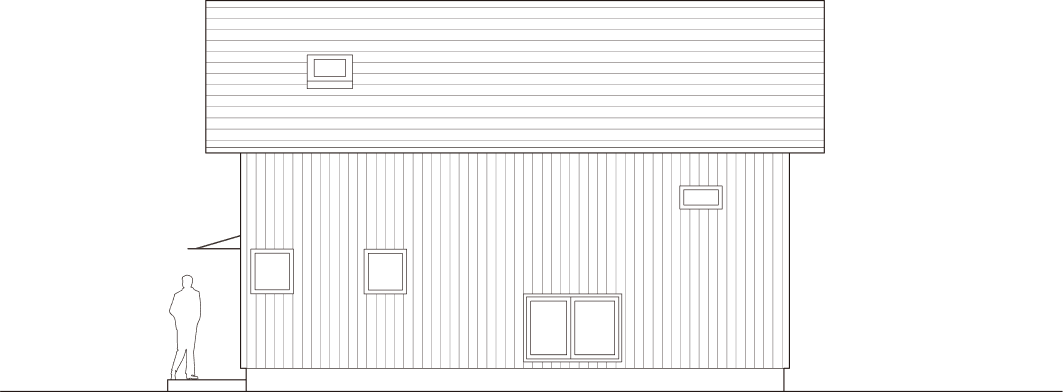 HUIZEN HUISJE 3LDKプランの1つ。元来、宿泊施設として計画されたプラン。性質上必要であった広い玄関土間収納は使い易さの観点からそのまま踏襲された。1階部分は4つのゾーニング(スクリーンルーム、リビング、ダイニング、キッチン)に分けられており、それぞれ全く異なる素材感、窓のスケール、そして天井高を持つ。各エリア、各アクティビティが、互いに存在感を主張し合いながらも、適度な間合いを取り、共存している。いつまでたっても飽きのこない、毎日を満喫させてくれる住まい。※規格住宅ではありません